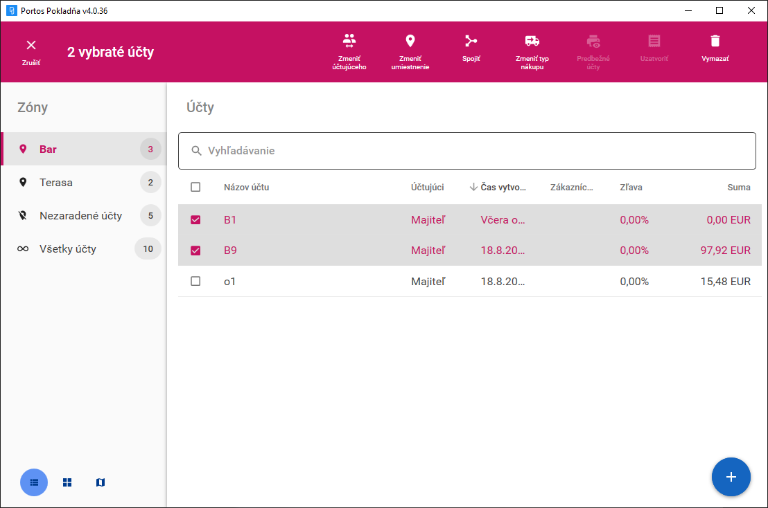 * [**Spojiť**](https://docs.portos.sk/pokladna/otvorene-ucty/rozdelenie-uctu): zlúči všetky označené účty do zvoleného účtu.