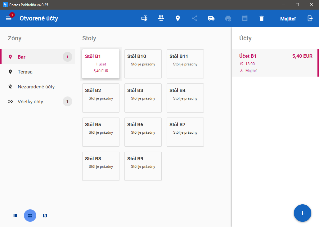 Aplikácia PORTOS Pokladňa podporuje tri spôsoby zobrazenia otvorených účtov: zoznam, dlaždice a mapa. Zobrazenie podľa dlaždíc alebo mapy zohľadňuje nastavenie [Zón](https://docs.portos.sk/nastavenie-systemu/zony).&#x20;