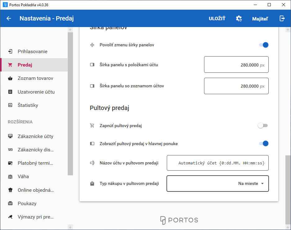 V prípade, že pultový predaj nepoužívate, môžete vypnúť jeho zobrazenie v hlavnej ponuke. Urobíte tak prepínačom v nastaveniach a zmenu potvrdíte tlačidlom **Uložiť**.&#x20;